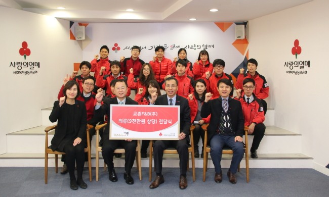 교촌에프앤비는 9000만원 상당의 의류 불용자산을 서울사회복지모금회에 기증했다. 14일 사랑의 열매에 전달된 물품은 동계점퍼, 티셔츠 등 총 3300여벌로 향후 소외된 이웃에게 전달될 예정이다. 교촌은 기업이념인 ‘나눔’을 전파하기 위해 원자재 출고량 1kg당 10원씩 사회공헌기금을 적립하고 있다.