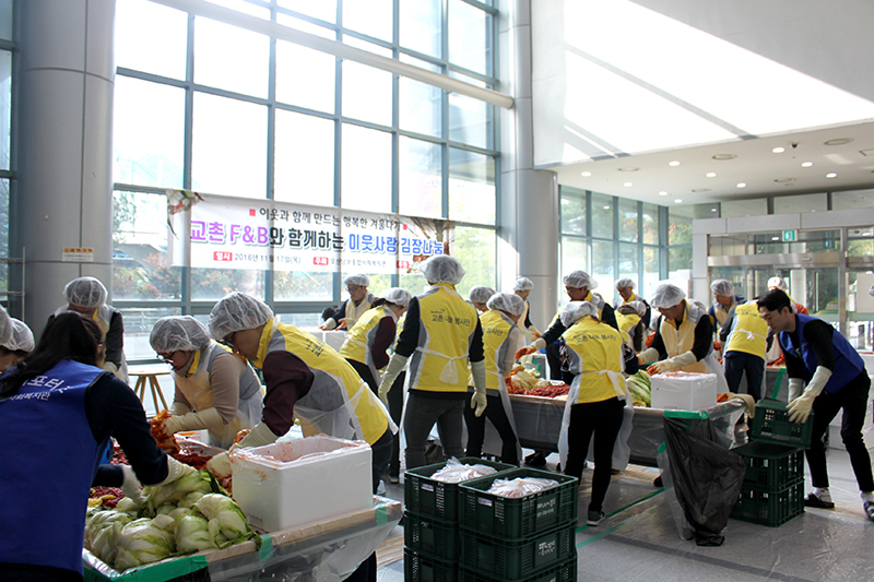 교촌은 지난해부터 여름과 겨울에 직접 담근 김장김치를 나누는 행사를 실시하고 있다. 지난 7월에는 경기도 오산 청호동 일대 저소득층 가정 80세대에 열무김치를 전달한 바 있다.