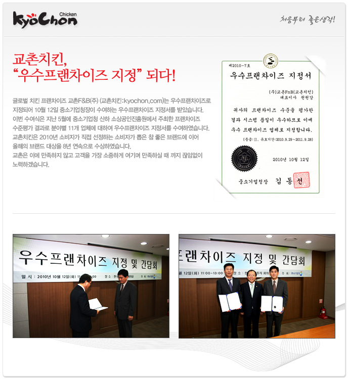 [] 교촌치킨, 우수 프랜차이즈 지정되다! 등록일 : 2010-10-13