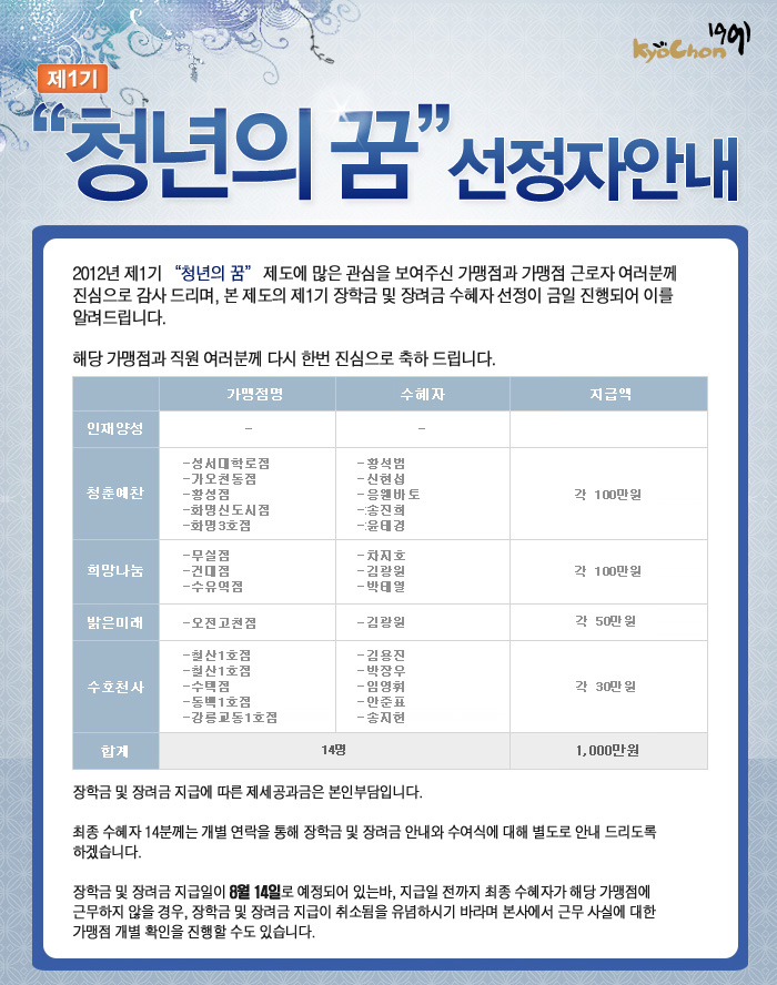 [] 제1회 청년의 꿈 선정자 공지 등록일 : 2012-07-12