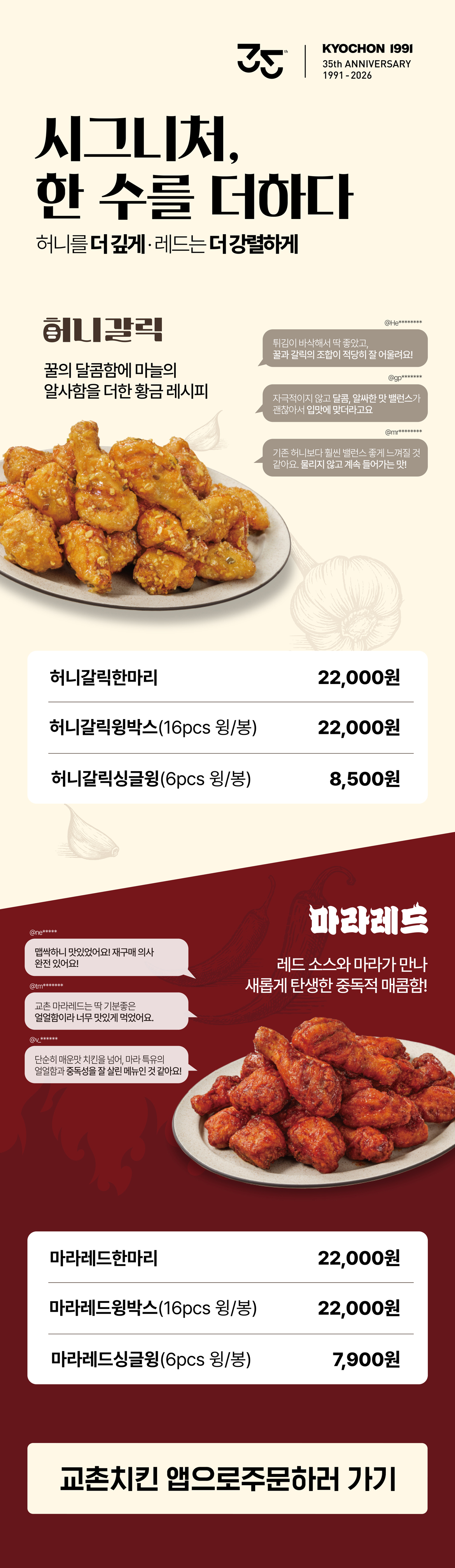 우리 교촌F&B를 이용하는 많은 고객님들 에게 무차별적이고 무분별하게 발송되는 타사(他社)의 메일 발송을 차단하기 위해서, 본 웹 사이트에 게시된 이메일 주소가 전자 우편 수집 프로그램이나 그 밖의 기술적인 장치를 이용하여 무단으로 수집되는 것을 거부합니다.